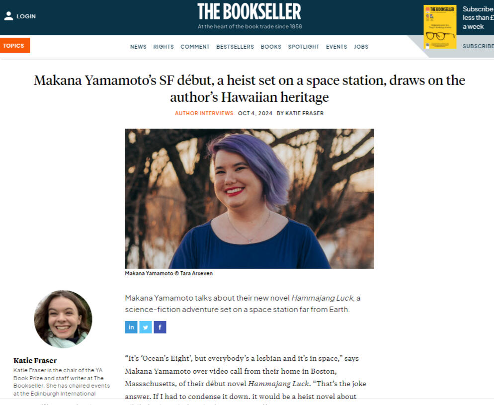 Makana Yamamoto was born on the island of Maui. Splitting their time between the Mainland and Hawaiʻi, Makana grew up on beaches and in snowbanks. Always a scientist at heart, Makana fell in love with sci-fi as a teen–they even led the science fiction and fantasy interest house at their college. A writer from childhood, fiction became the perfect medium for them to explore their interests as well as reconnect with their culture, coalescing into a passion for diverse sci-fi. They love writing multicultural settings and queer characters, as well as imagining what the future might look like for historically marginalized communities. Their debut novel, Hammajang Luck, is a 2025 Locus Award Finalist.
