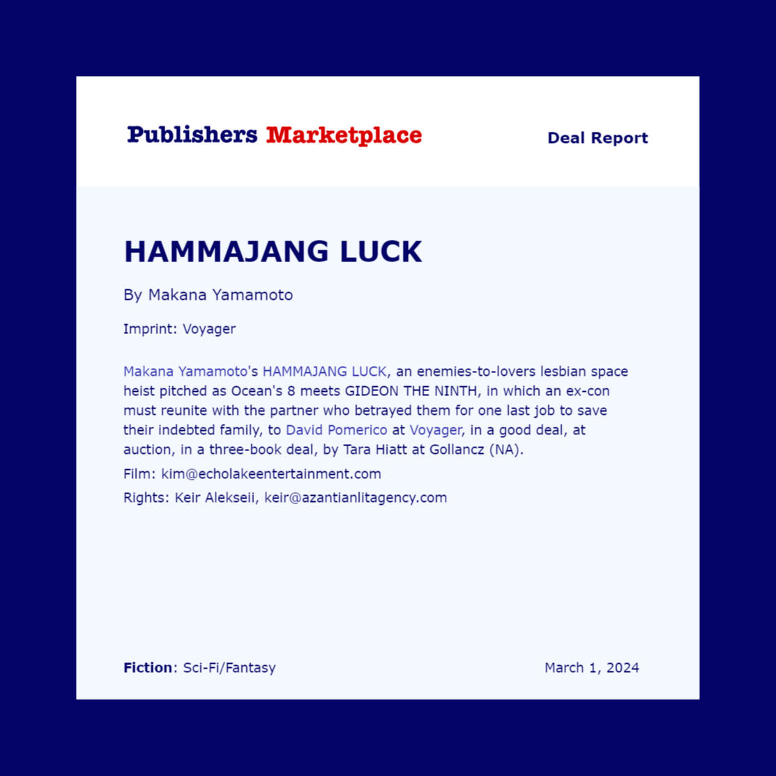 Hammajang Luck is a 2025 Locus Award Finalist for Best First Novel!Hammajang Luck is a 2025 Goodreads Choice Awards Nominee!"Yamamoto draws on their Hawaiian background while giving Ocean’s 8 a space opera twist in their entertaining debut... This is a blast.” - Publisher's Weekly"Like an Ocean’s movie set in space, Hammajang Luck will charm readers looking for a smooth ride with a lovable cast." - Book Page"Hammajang Luck has more to say than Ocean’s 8, the setting is more thoughtful and relevant than Blade Runner, and you still get the heist you came looking for! Seriously. What more could you ask for?" - Lightspeed Magazine“Hammajang Luck features all the best SF has to offer…between the lovable, queer cast of characters, the Hawaiian representation, and the action-packed heist, Yamamoto will leave readers excited for their next book.” - Starred Review from Booklist“Makana Yamamoto’s debut... is a splendid addition to the genre. With queer and trans characters, an is-this-a-romance, excellent team banter, and an exasperated sibling for Edie, all on top of a daring and audacious heist, there is an enormous amount to love...” - Locus Magazine"It possesses all the sterling attributes of the classic heist narrative, and adds in romance elements, plus the topic of familial bonds. The resulting blend is wholly organic and effective." - Locus Magazine 2024 Retrospective"...Yamamoto makes great use of each word, saying so much with a modest selection of words... Hammajang Luck is a master class on the “tempo” of writing compelling scenes." - Soapberry Review