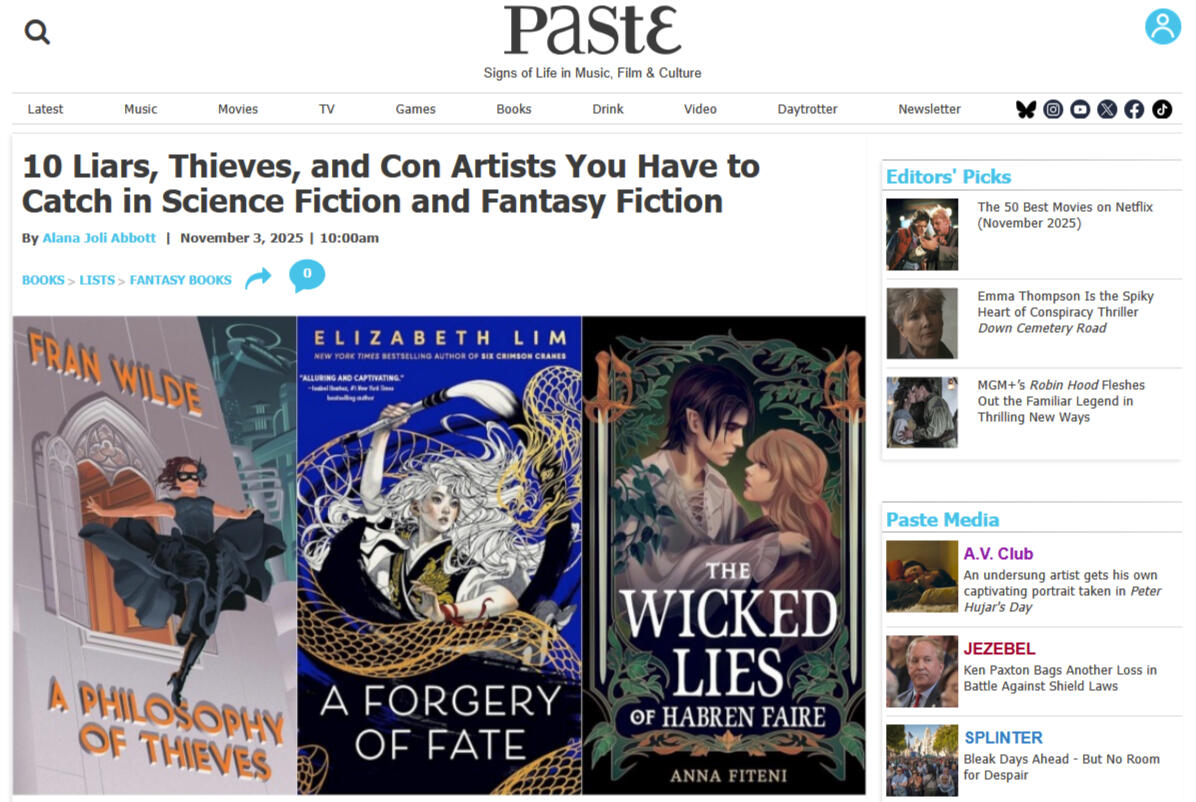 Hammajang Luck is featured in Paste Magazine's 10 SFF Liars, Thieves, and Con Artists You Have to Catch roundup